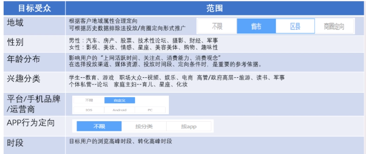 结合广告主产品的用户属性(如年龄、地域、性别、时间段等)来设置,从而提升效果达成转化。