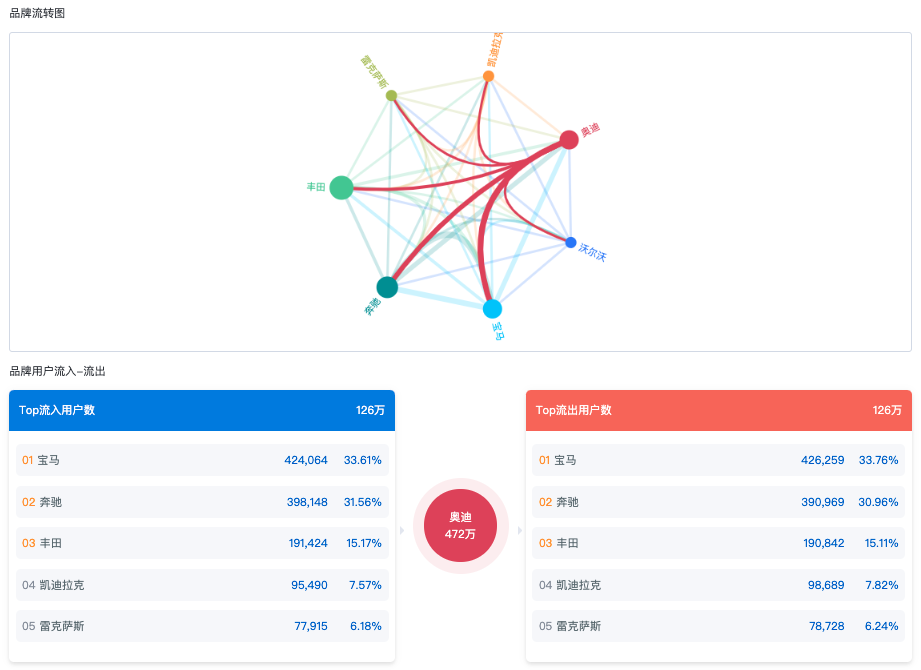 通过流转图及流出-流出用户数,直观呈现品牌用户的竞品流转偏好;