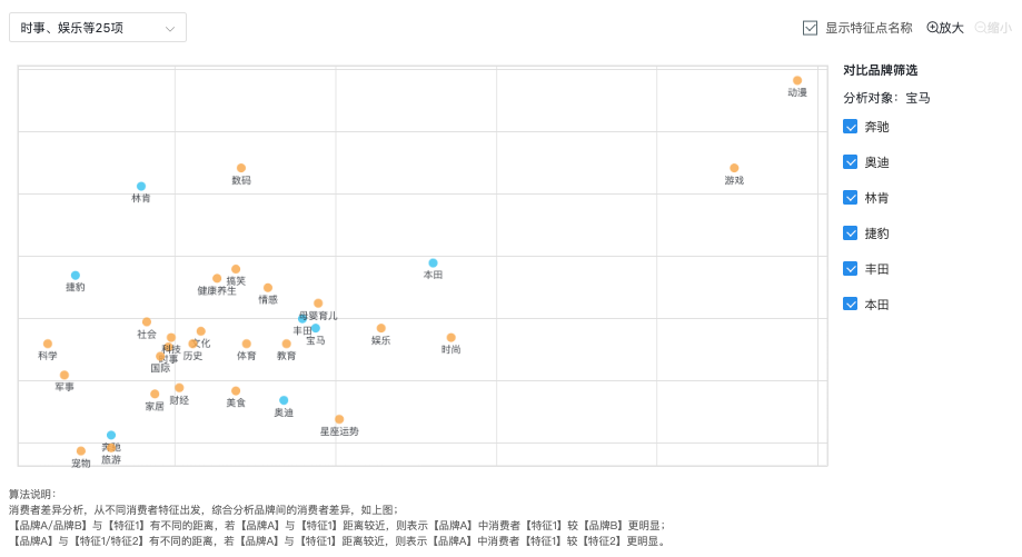【旅游】特征,离奔驰最近,其次是奥迪/捷豹等品牌,可判断为奔驰消费者在5月期间对旅游类内容较其他品牌,更显著;【动漫/游戏】2个阅读特征,离所有汽车品牌都很远,表示汽车消费者对游戏/动漫类内容的阅读偏好都不强;