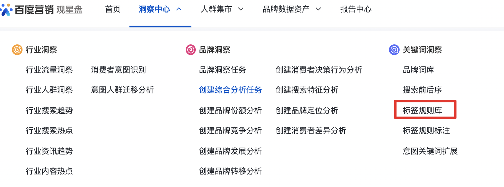 1、 入口:观星盘-洞察中心-品牌洞察-创建品牌洞察任务 或 新建综合任务;也可参考蓝色框直接创建某个分析任务。