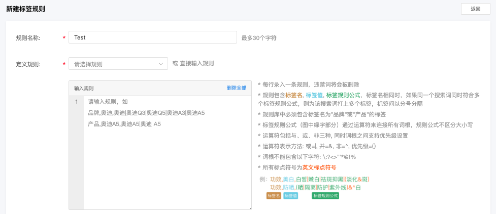 备注:定义标签规则时,建议以【词根】形式定义标签规则,不需要为所有关键词打标签;