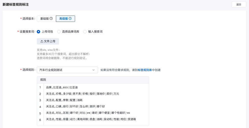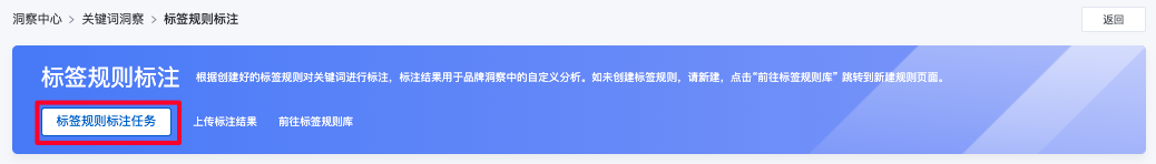 - 标签规则标注任务,在线定义关键词的标签规则,系统自动为关键词打标签