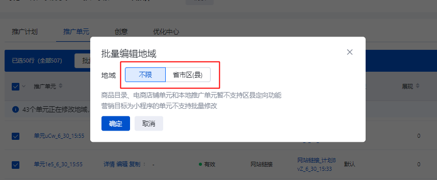 Step2:选择【不限 】则默认当前所选的所有单元,直接修改为不限地域投放;选择【省市区(县)】则进入省市区县批量修改页面(见下一步):