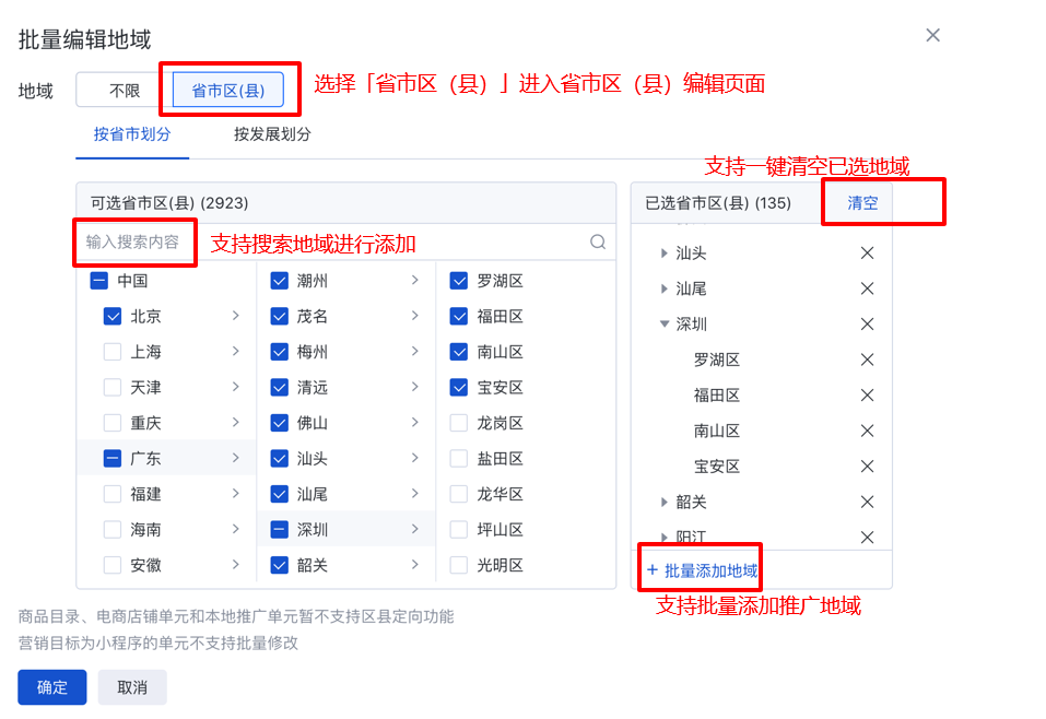Step3:省市区(县)批量修改页面,支持通过搜索添加地域、批量添加地域(同新建单元-地域定向-批量添加地域功能一致)等(见下图):