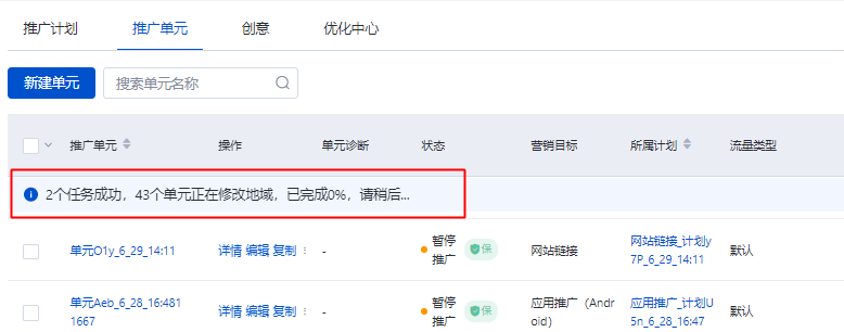 Step4:如您所选单元较多,则进入后台任务。推广管理列表会显示当前任务进度(如下图示意):