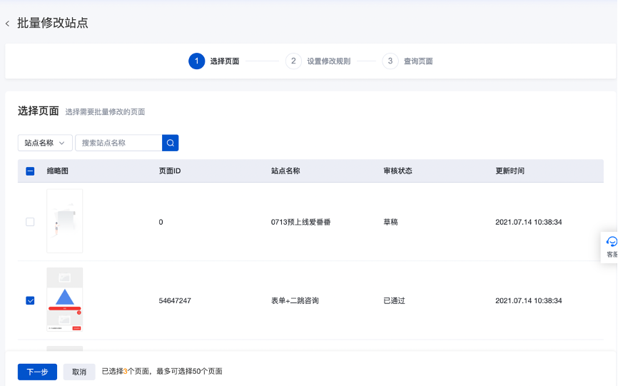 如落地页本身为草稿、审核未通过状态,修改后如需送审,可到【我的站点】,找到相应站点并提交审核,或者在批量修改列表页点击页面名称,直接跳转到【我的站点】中该页面处;