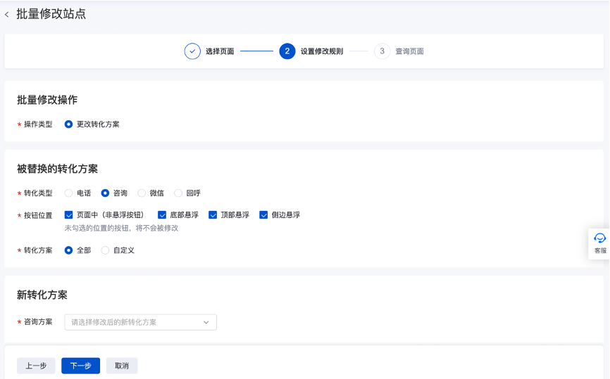 1、功能介绍:支持在短时间内批量选择一批页面,并批量修改落地页中的转化组件(本期支持咨询、电话、回呼、微信四种转化组件),实现快速切换转化方案,提高效率。