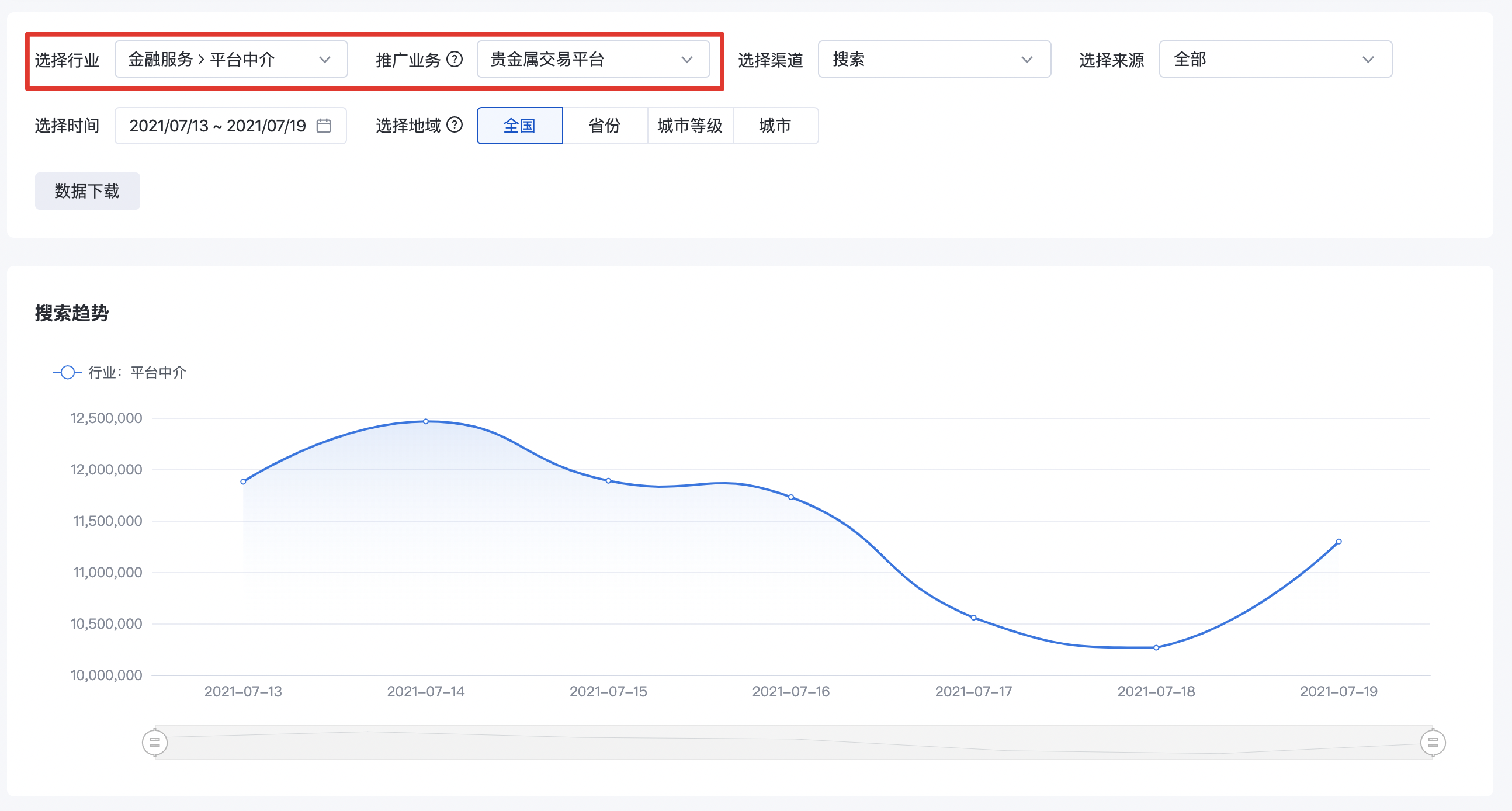 搜索趋势:支持200多个行业、7000多推广业务,分PC、WISE以及不同地域的搜索趋势分析