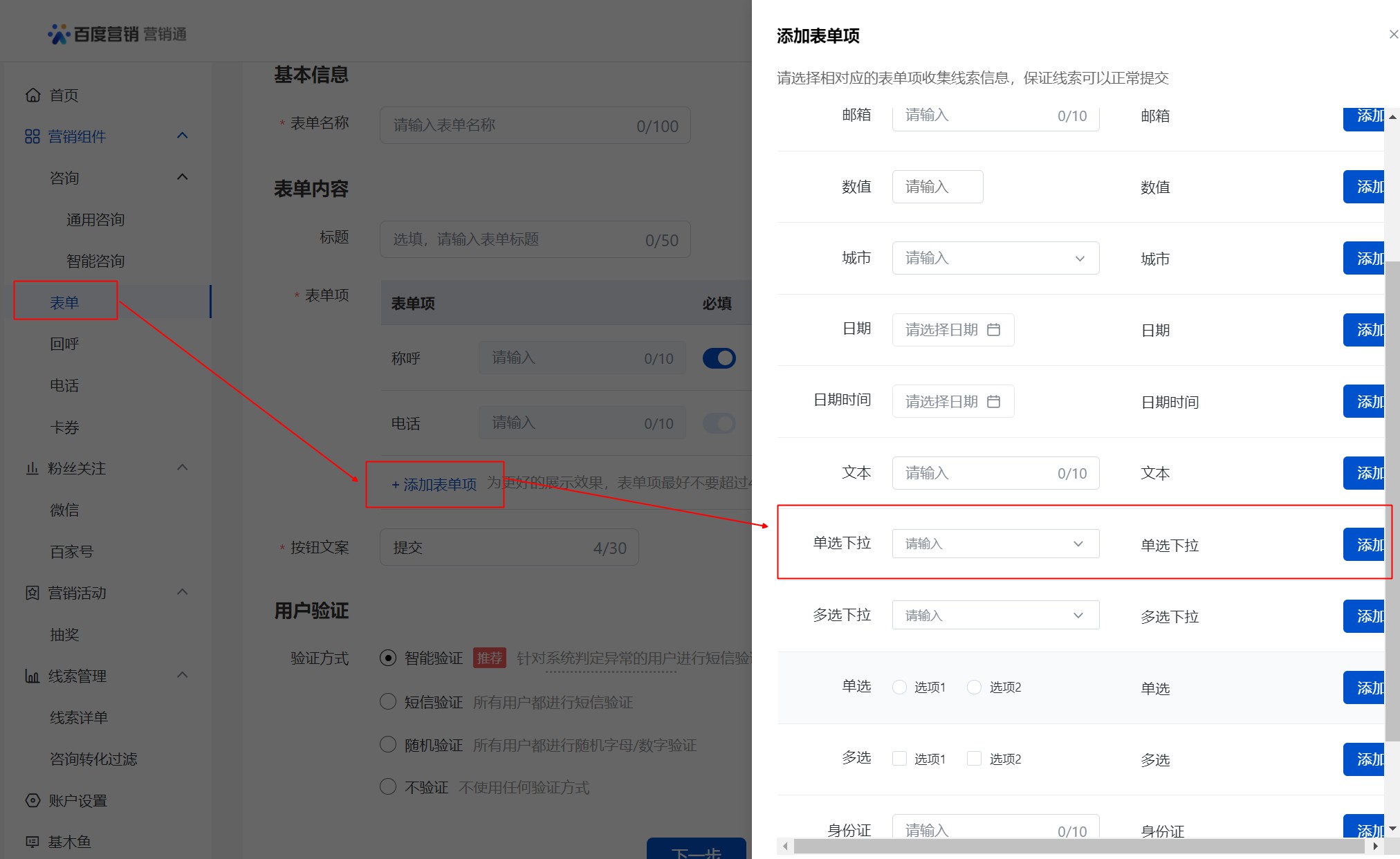 第一步:新建单选下拉表单:在营销通-表单-新建表单,表单项选择添加“单选下拉”