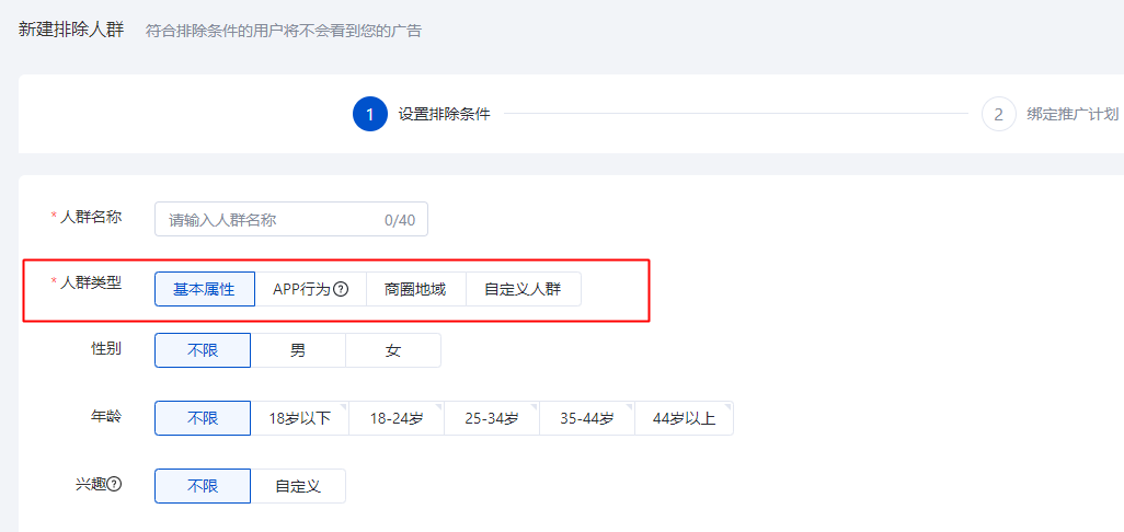 1.2 新建排除人群:支持按照基本属性、APP行为、商圈地域和自定义人群四种类型做人群排除