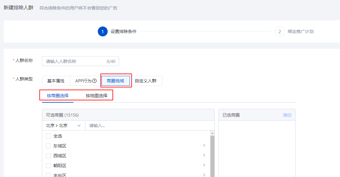 2.1入口:搜索推广投放平台-定向-人群-排除人群-商圈地域