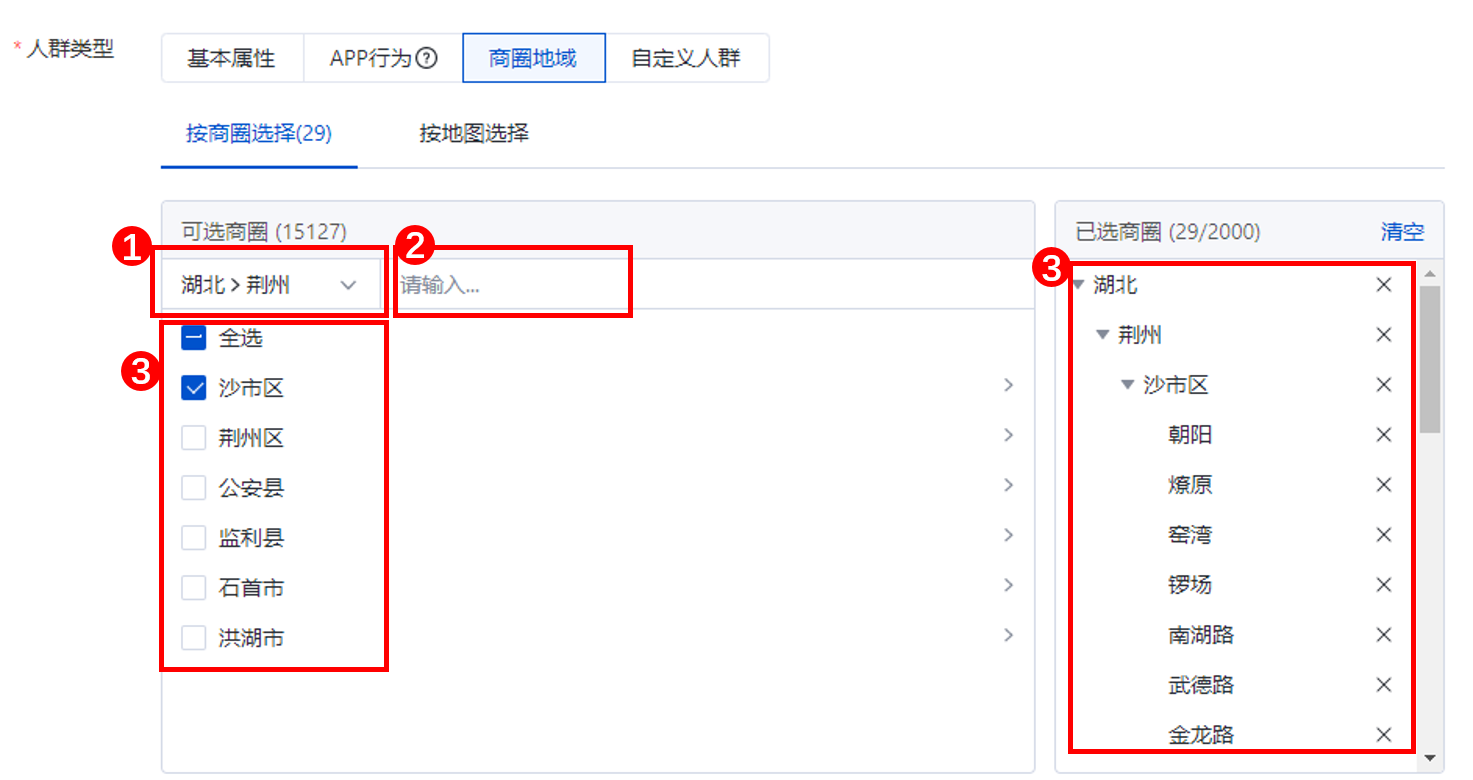 ③所选的商圈在此处呈现,可点击“X“删除不需要的商圈(按商圈选择最多可选择2000个商圈)