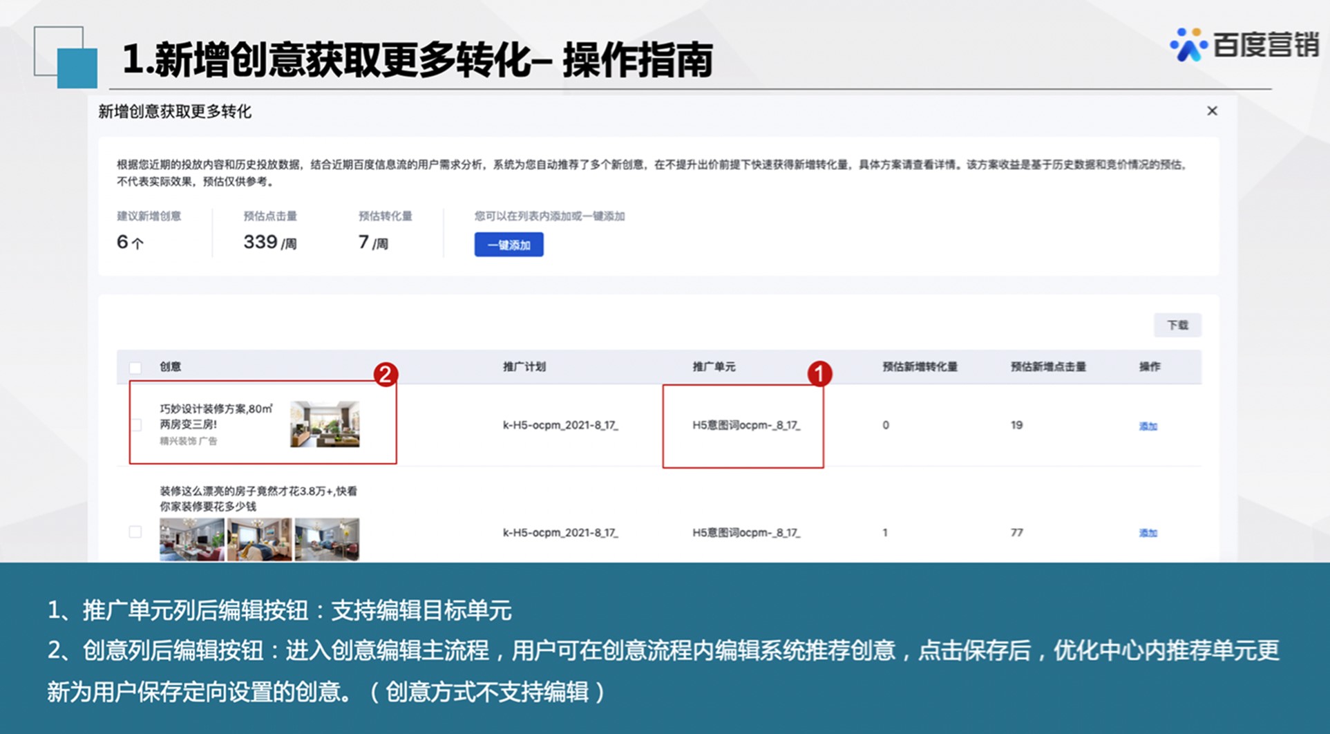 - 可以提供哪些帮助?根据您近期的投放内容和历史投放数据,结合近期百度信息流的用户需求分析,系统为您自动推荐了多个新创意,在不提升出价前提下快速获得新增转化量。