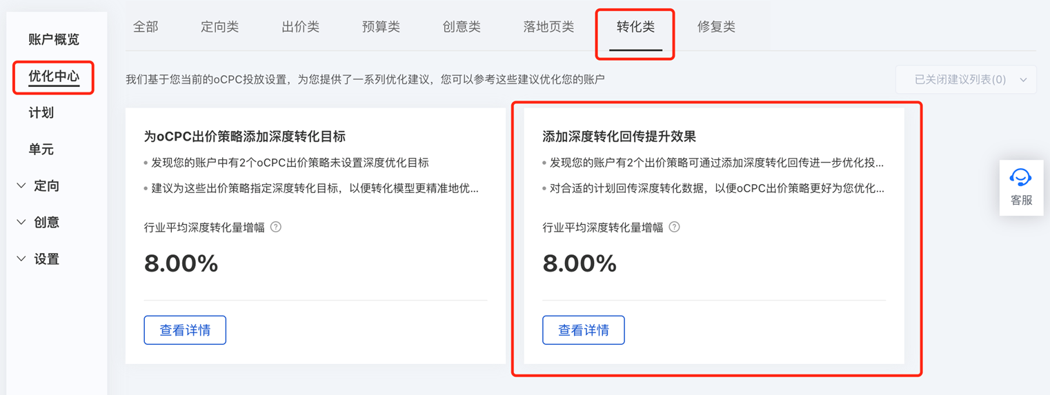 - 优化中心-转化类-【添加深度转化回传提升效果】: