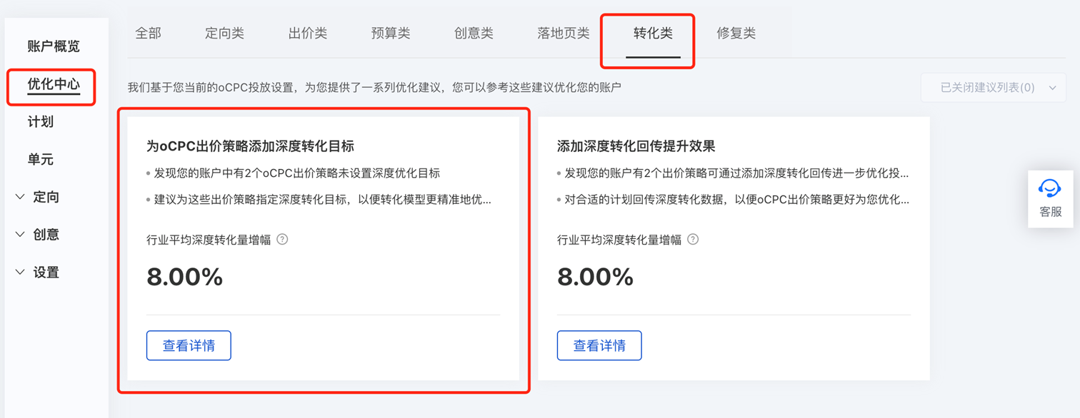 百度搜索推广-“优化中心”新增oCPC投放相关建议