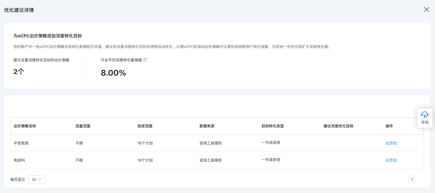 点击【查看详情】,您可以看到系统为每个出价策略推荐的【深度转化目标】。您可以账户实际投放情况,选择为合适的oCPC出价策略设置深度转化目标,以进一步提升转化效果。