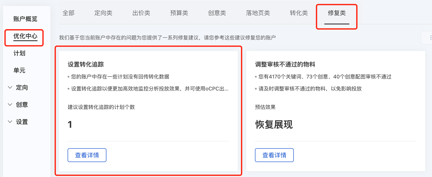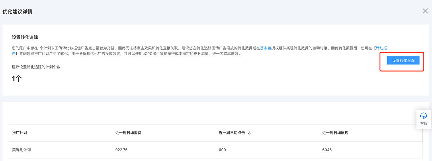 - 优化中心-修复类-【设置转化追踪】:
