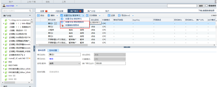 1)、功能入口:信息流推广客户端-推广单元—优化目标为转化,落地页类型选择百度小程序,输入APPkey、页面路径。支持多创意批量修改。