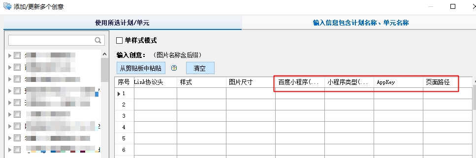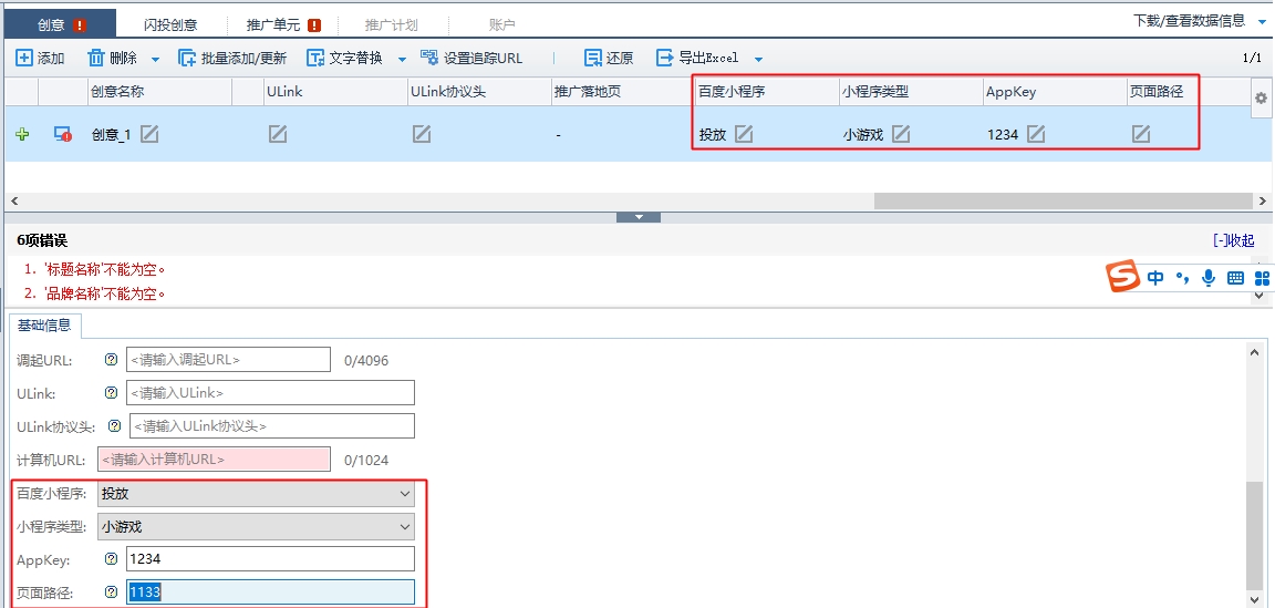 2)、支持excel批量添加,如需投放小程序,请正确填写“百度小程序”为”投放“否则系统默认为”不投放“;如需投放”小游戏“,在小程序类型正确填写为”小游戏“,否则系统默认为”小程序“。