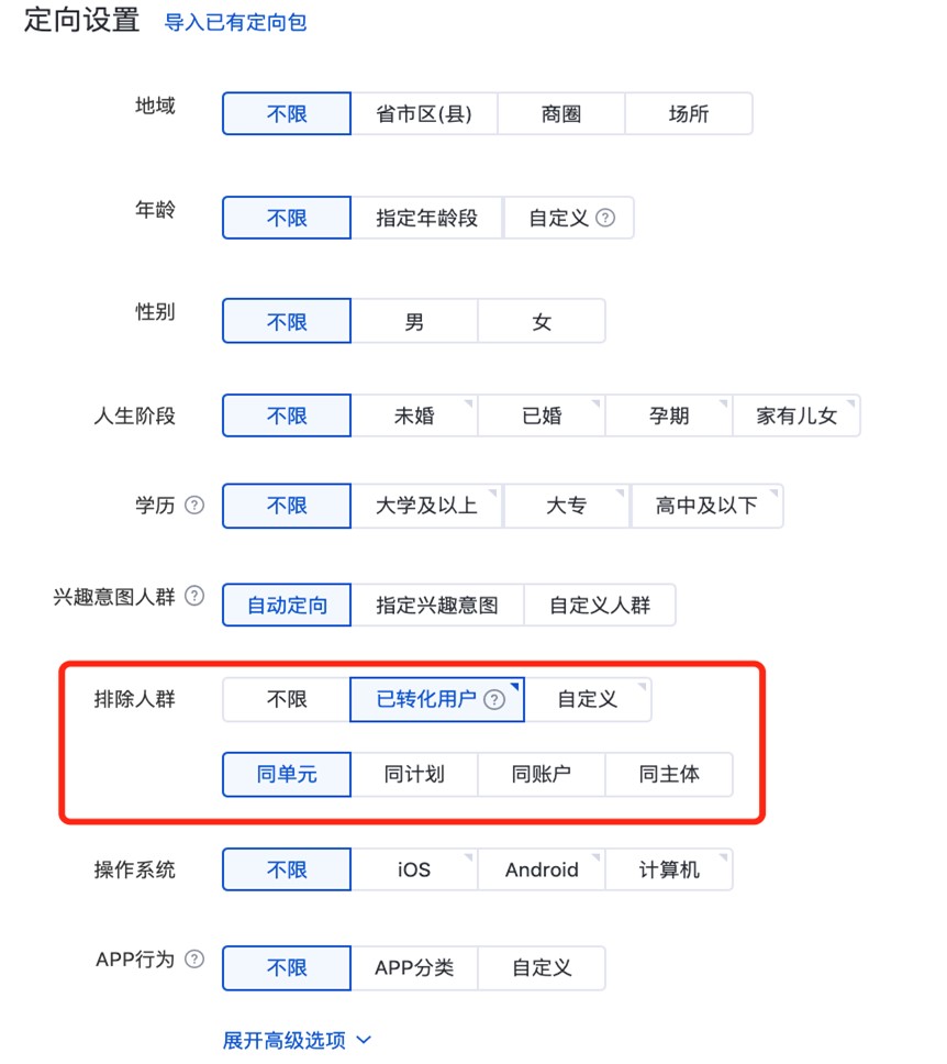 信息流推广投放平台:新建/编辑单元—定向设置—排除人群(全部营销目标下均可使用),如下图: