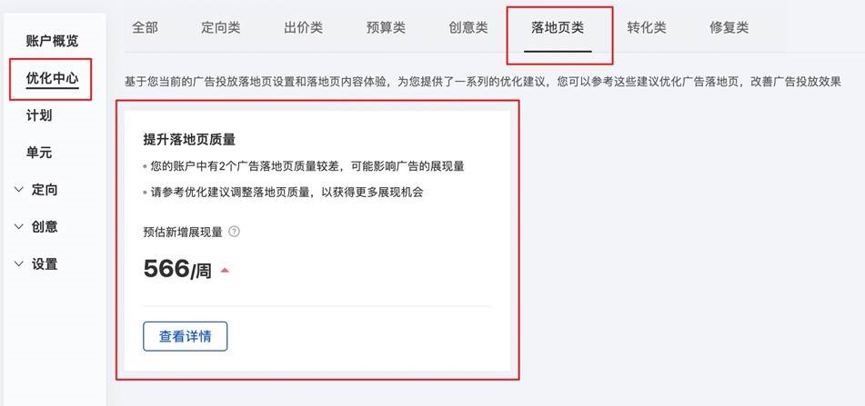 优化中心“提升落地页质量建议”易用性升级-搜索推广