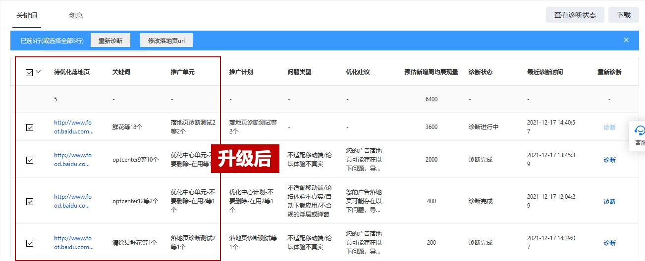 物料列表直接披露有质量问题的落地页URL、问题类型、优化建议及诊断状态等,广告主可以一目了然地看到账户下待优化的落地页个数及详细信息。
