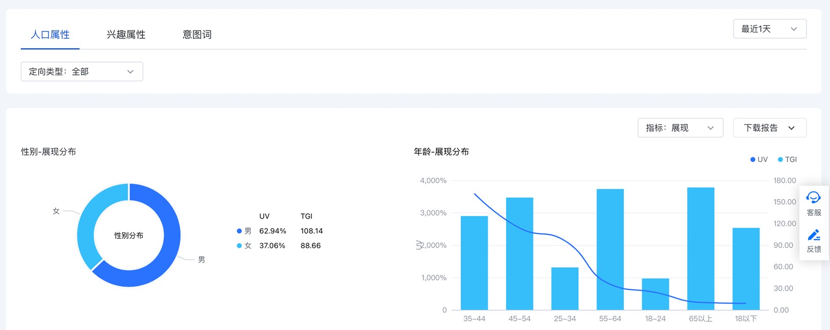 为了帮助广告主从用户流量视角查看定向受众效果,通过用户画像方式让广告主清晰了解其广告投放的受众,信息流专项报告新增定向受众报告,通过UV占及TGI 数据指标,快速定位高意向人群,让广告主在洞察投后行为的情况下,提升广告投放效率与效果!