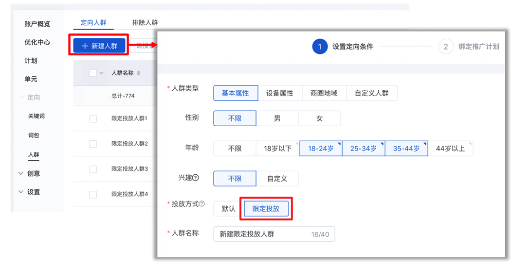 2)“限定投放”:本次升级新增功能。支持对设定范围内的人群进行定向投放;
