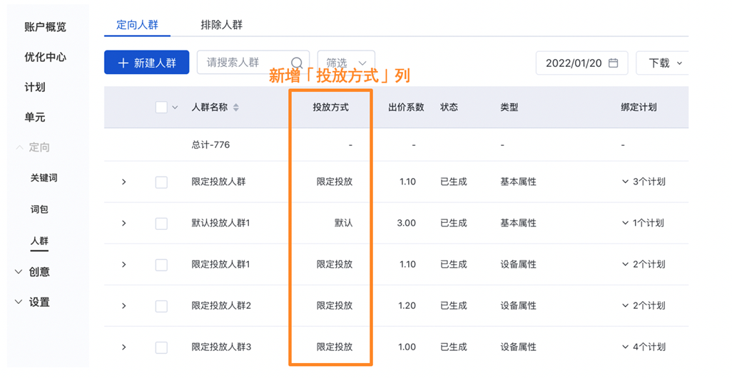 升级点2: 人群投放管理列表新增“投放方式”列:支持查看当前人群设定的投放方式