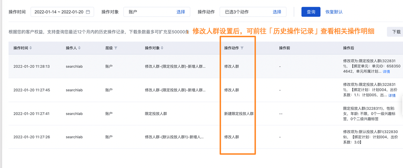 升级点3: 历史操作记录-人群操作记录同步升级:修改人群设置后,可在历史操作记录中查看与下载