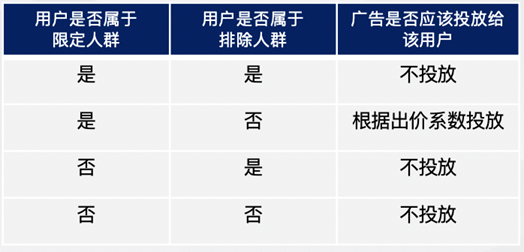 当计划同时绑定了限定人群和排除人群时,广告投放规则如下: