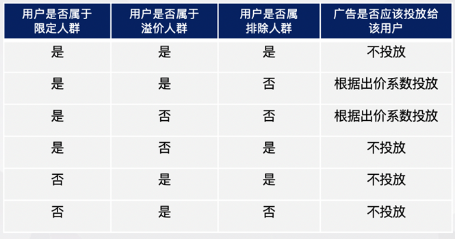 当计划同时绑定了限定人群,溢价人群和排除人群时,广告投放规则如下: