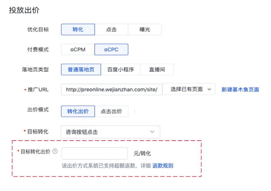 对于当前正处于oCPC一阶段的推广单元(即“付费模式”选择【oCPC】,“出价”含【点击】的单元),在近期会保持投放效果平稳,但请尽快确认已对“目标转化出价”进行了合理设置, 详细操作建议如下: