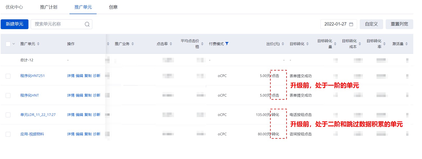 存量的oCPC一阶单元,如果在2022年3月17日之前未更新为【目标转化出价】(即原【跳过数据积累-是】的出价模式),系统会统一将其更新为oCPC目标转化出价,届时将不再遵循点击出价。