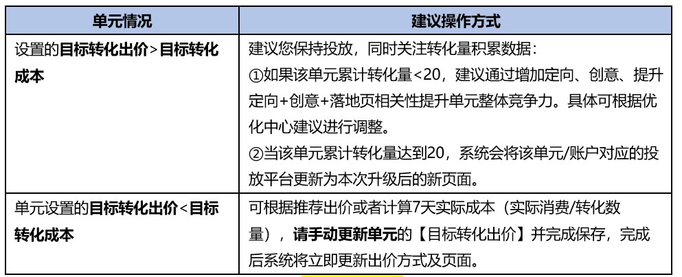 A:您可以正常优化单元的定向、创意、落地页、出价模块,在优化出价时,当您修改【目标转化出价】并完成保存后,系统会将该单元/账户对应的投放平台更新为本次升级后的新页面。
