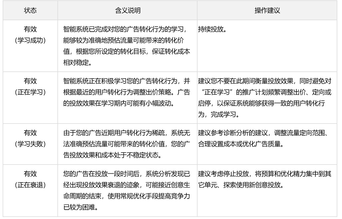针对优化目标为转化(oCPC/oCPM)的“有效”状态下的单元,在“有效”文案后增加展示学习期状态,包括“正在学习、学习成功、学习失败、正在衰退”4种。学习状态含义说明如下: