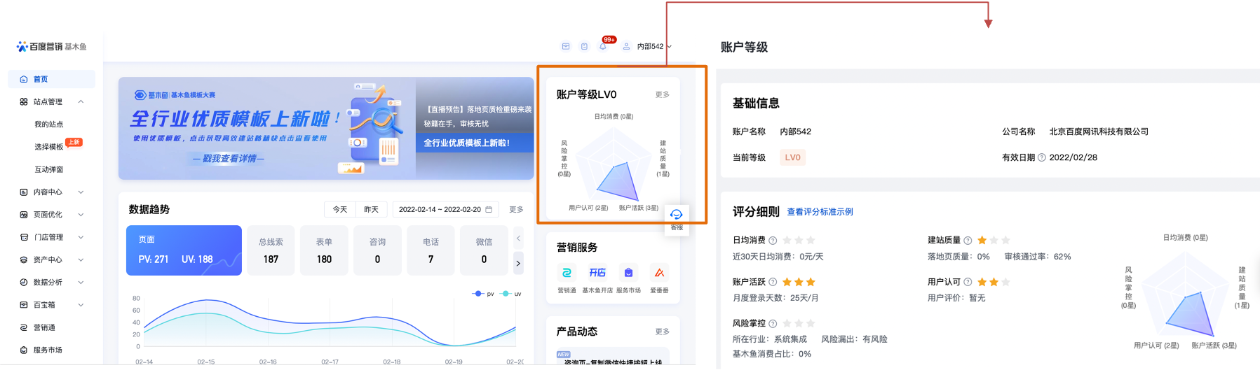 2.功能简述:基木鱼账户等级设有LV0~LV5,依据消费量级、风险掌控力、建站质量、账户活跃度、用户认可5个评分维度进行账户等级计算。系统每月1日自动更新账户等级相关信息,查看路径:在基木鱼平台首页右上方,即可查看您的账户等级,点击“更多”即可查看账户等级的各维度评分及权益信息。