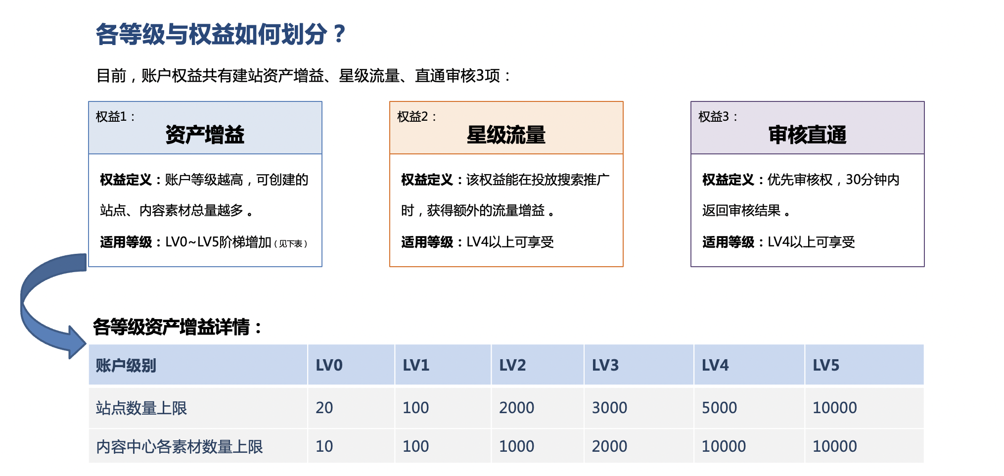 3.等级与权益划分:目前,账户权益共有建站资产增益、星级流量、直通审核3项,其中,星级流量与审核直通仅限LV4以上账户享受。