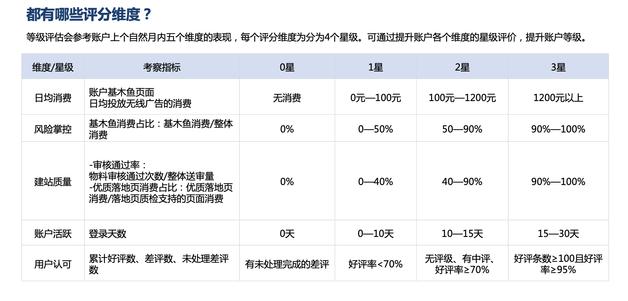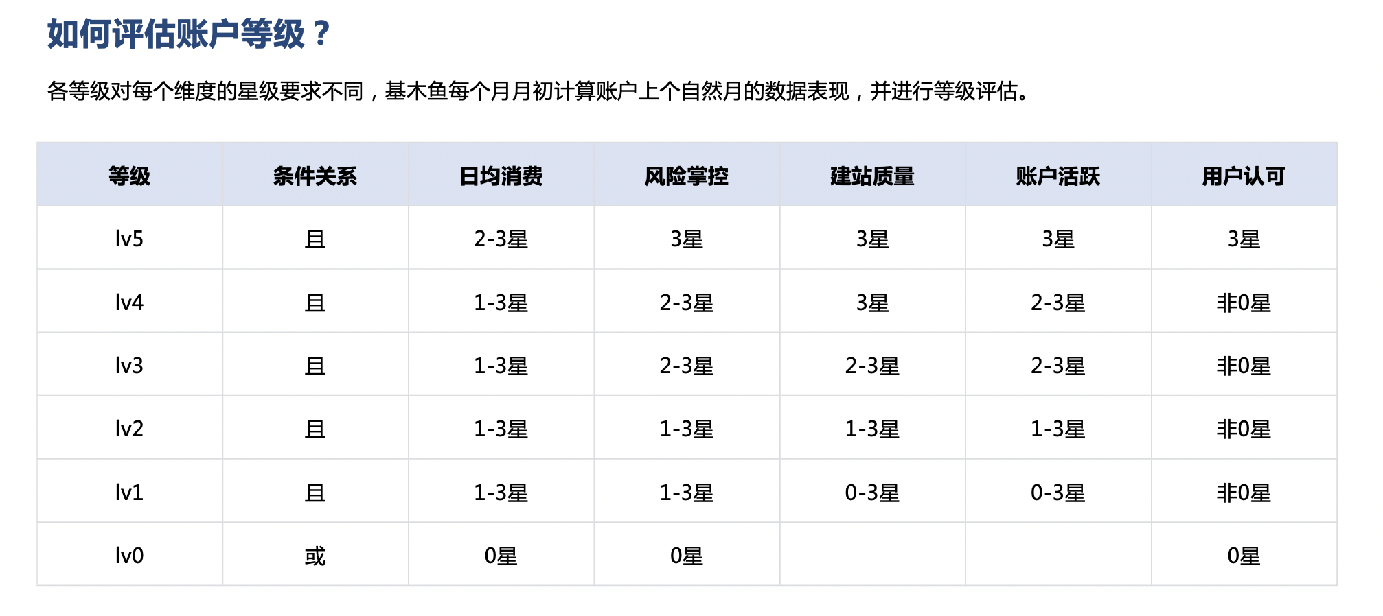 4.账户等级评估方式:等级评估会参考账户上个自然月内五个维度的表现,计算出所属等级。