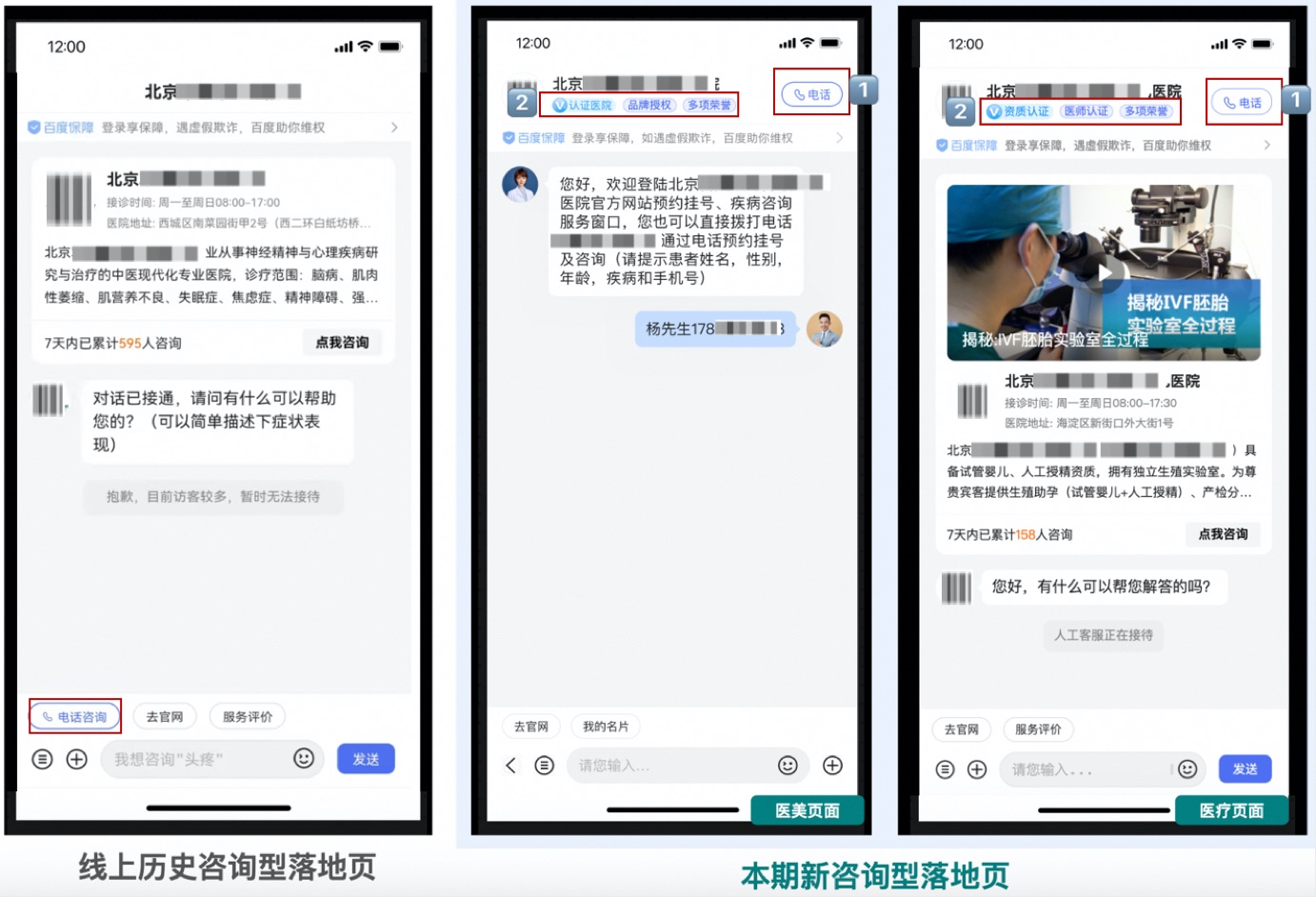 1)“电话按钮”由快捷咨询区域,上移至顶部机构标题区披露展示,强化其他非咨询的转化入口。