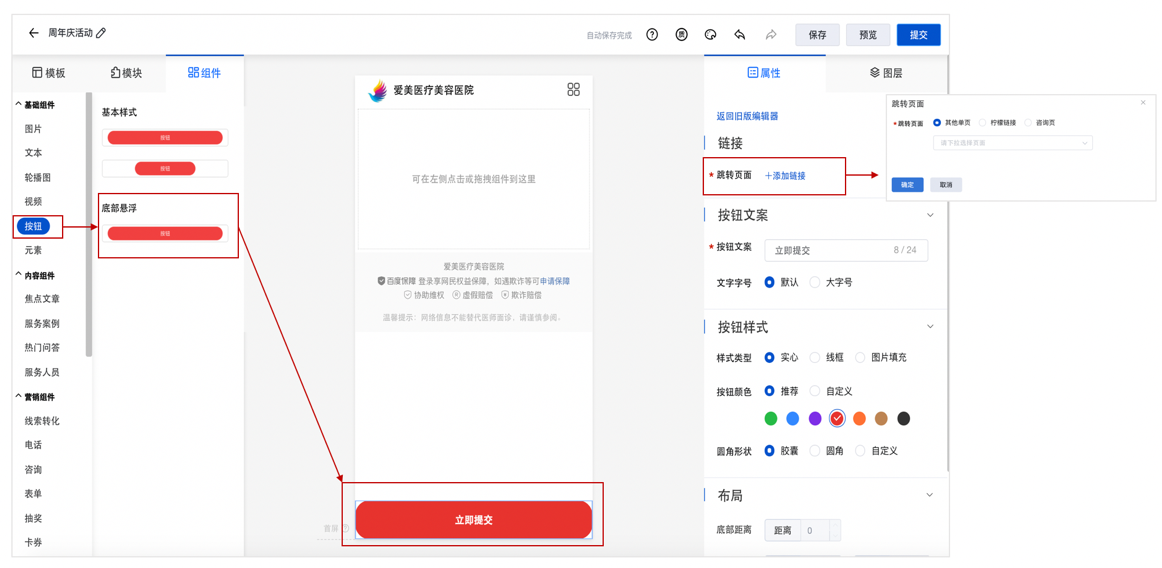 1、支持设置跳转营销页、柠檬爱美链接(除商品页)、咨询页
