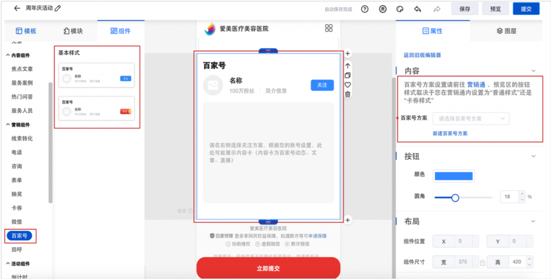 1、支持引用客户在营销通-百家号进行创建的百家号方案;