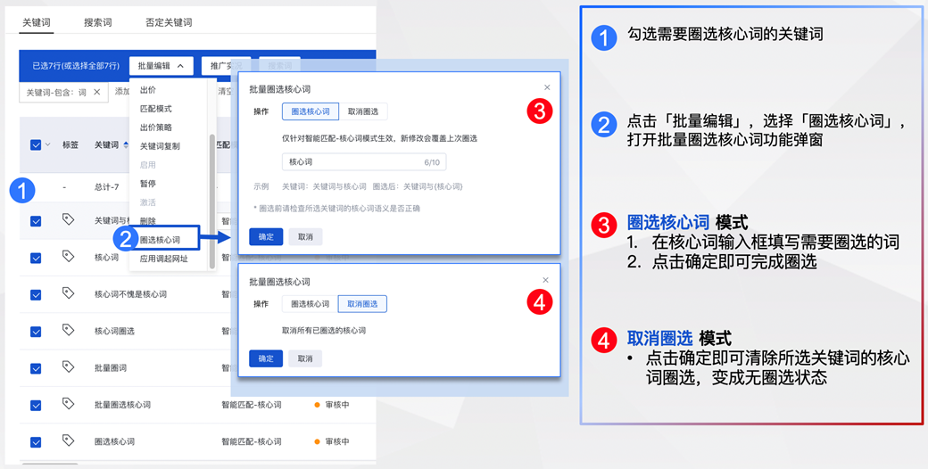 勾选关键词,点击「批量编辑」,选择「圈选核心词」触发二次确认场景,自动弹出二次确认弹窗
