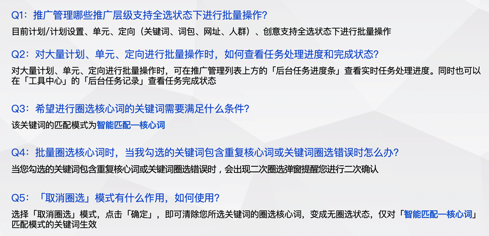 针对以上问题,本次对“推广管理批量操作能力”进行升级,升级后将支持更多批量能力,优化用户体验及操作效率,为客户提供更高效、更全面的批量操作能力。