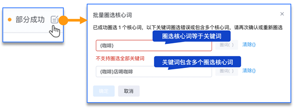 打开「后台任务记录」,找到批量圈选核心词任务点击“部分成功”右侧按钮弹出二次确认弹窗