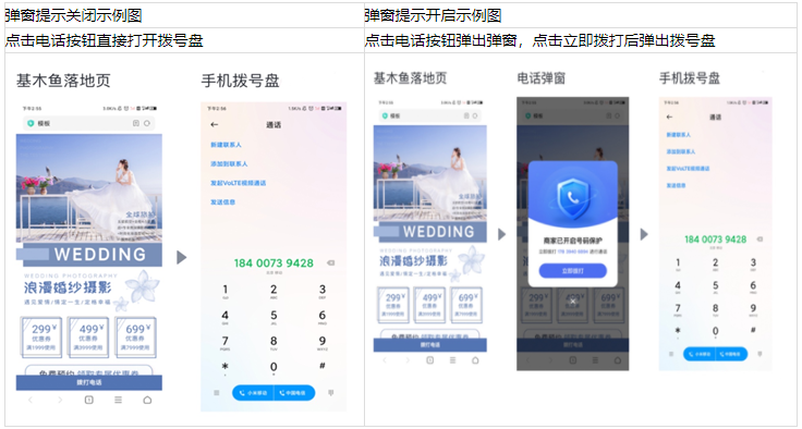 ①功能介绍:若客户使用了智能电话产品,且开通电话弹窗功能,则当网民在搜索前卡和基木鱼落地页内点击智能电话按钮时,将显示告知弹窗,点击立即拨打可继续拨号。