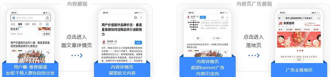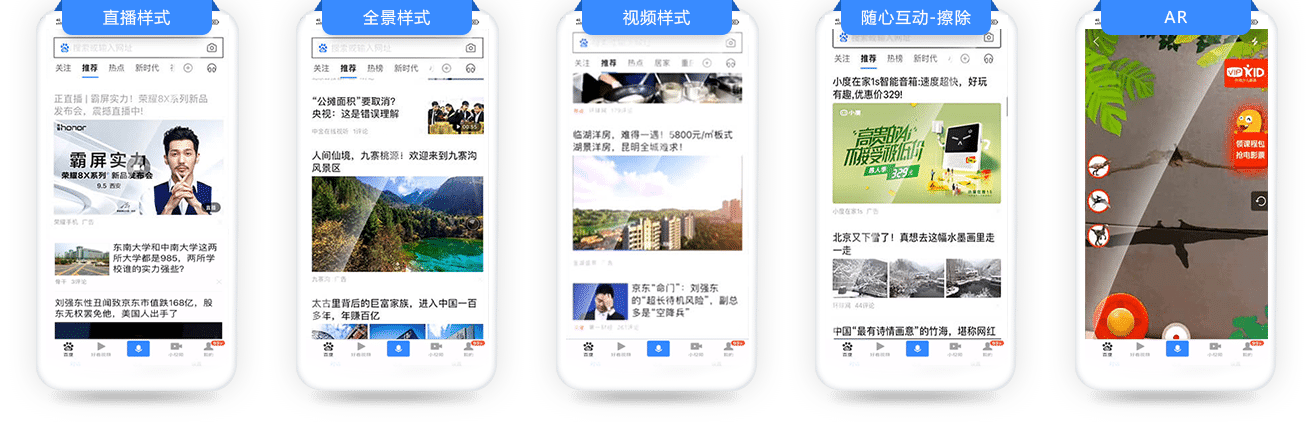 展现位置:百度APP\WAP:推荐频道第一、二广告位、图文详情页、视频详情页后贴、视频列表页、小视频详情页;好看:视频列表页;贴吧;列表页/内容页。